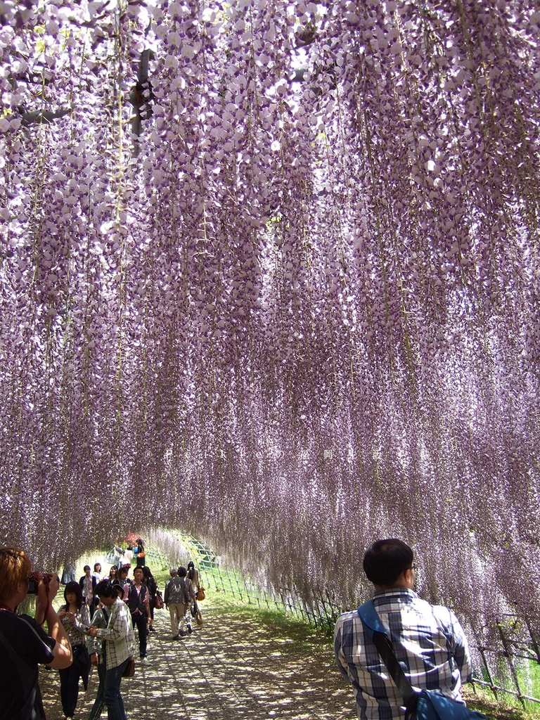 有很多人在紫藤隧道裡拍照,
