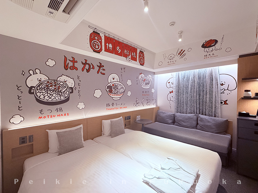 真的超可愛的,牆壁滿滿是博多的必吃美食,例如:牛腸鍋、豚骨拉麵、明太子…等。這主題房共有2間,每間都是雙人房。