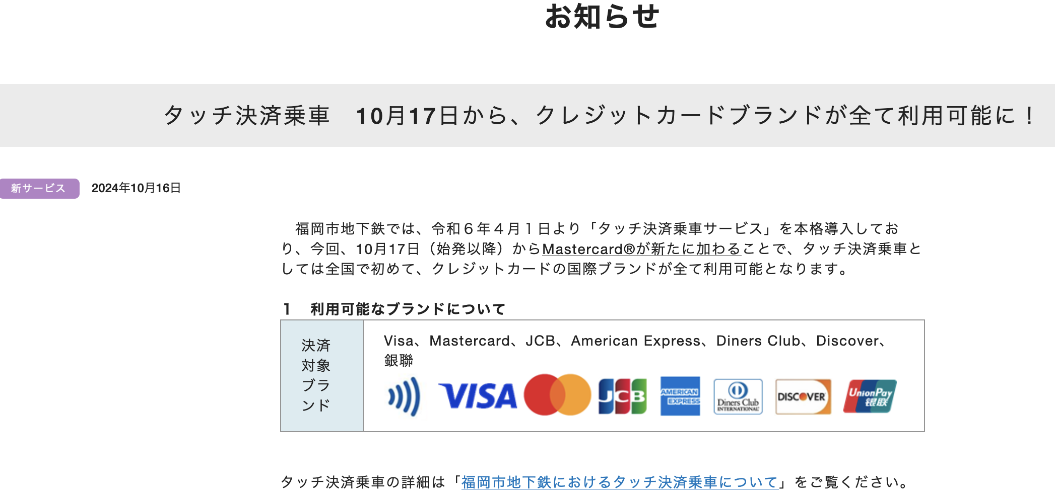 福岡市地下鐵自2020年4月1日起全面推出“Touch支付乘車服務”,現於10月17日(首趟列車後)起新增Mastercard®,首次允許Touch支付乘車服務。信用卡品牌都將可用。