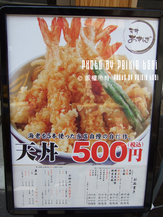 這間賣天丼的商店門口擺出海報,是一碗500円的天丼