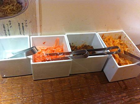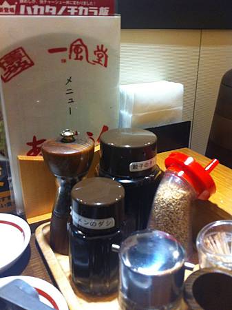 吧檯前一整排的調味料,有餃子沾醬、拉麵的調味汁、白芝麻、黑胡椒…等等。