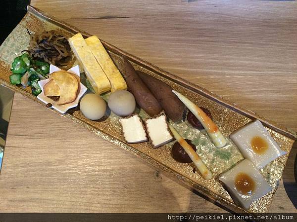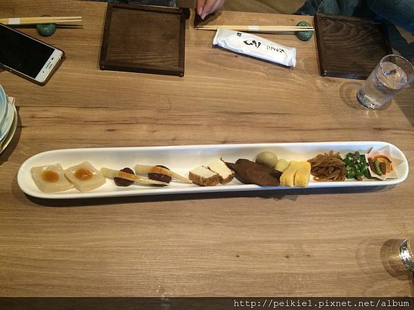 這次三種釜飯都點了,首先送來的是長長盤子上疊滿日式的開胃小菜,