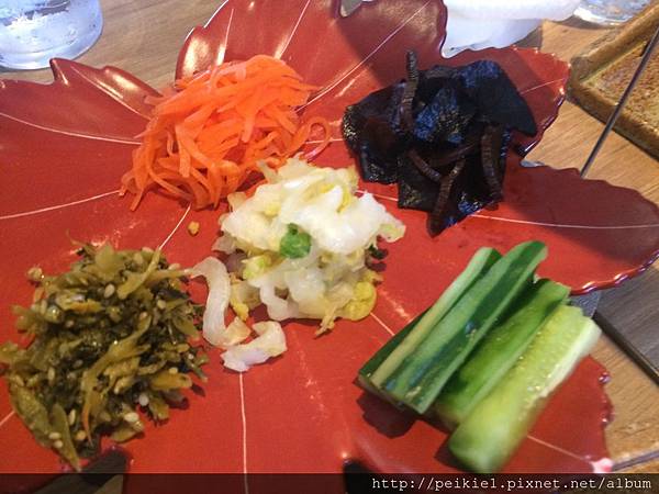 有紅蘿蔔絲、黃瓜、高菜(像台灣的鹹菜)...等。