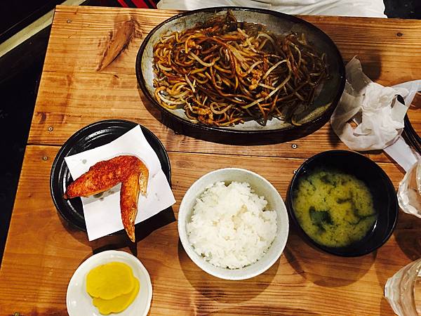這就是炒麵套餐,小炒麵+炸雞翅+白飯+漬物+味噌湯。約莫800日圓!