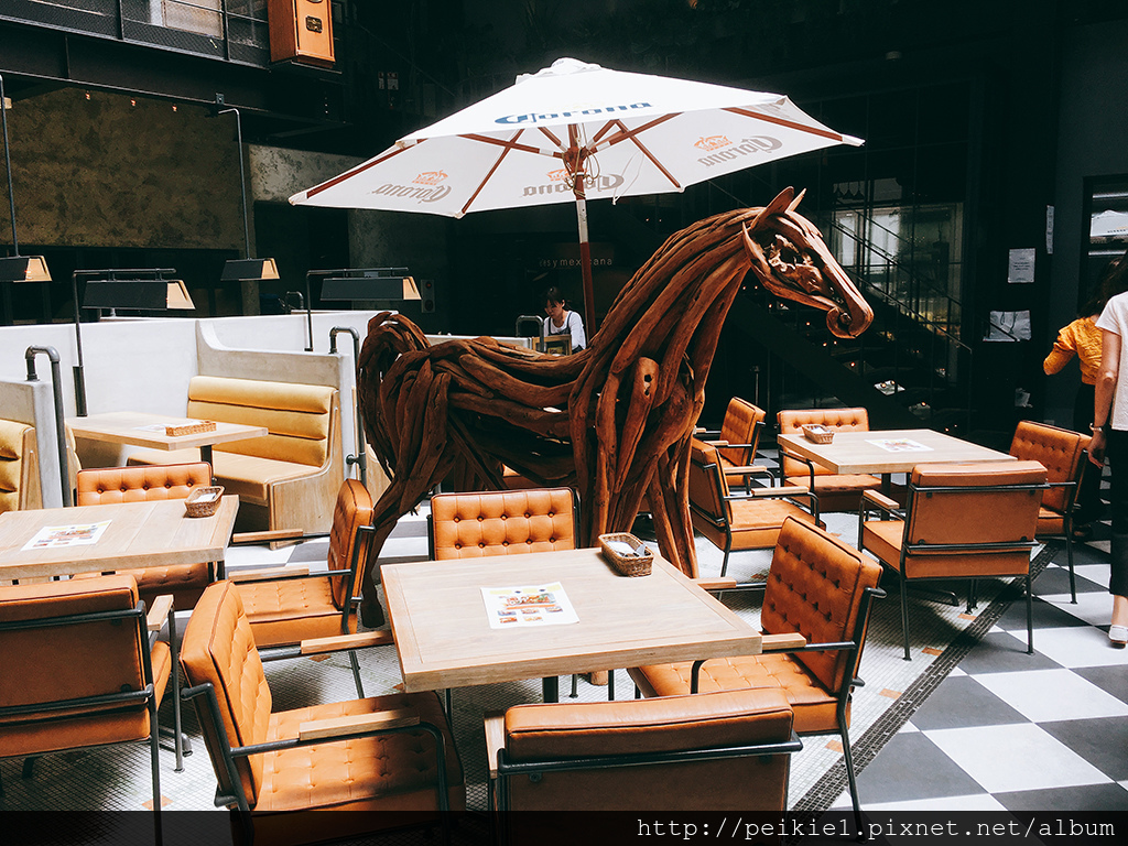 一走進餐廳後,餐廳的中間就有隻用木條製作的馬。