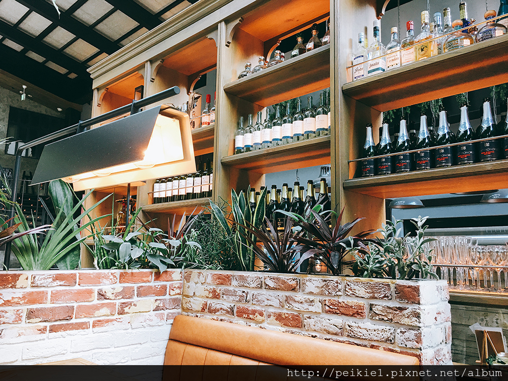 一進門左手邊的吧檯牆面,也是由酒瓶裝飾而成的酒櫃,