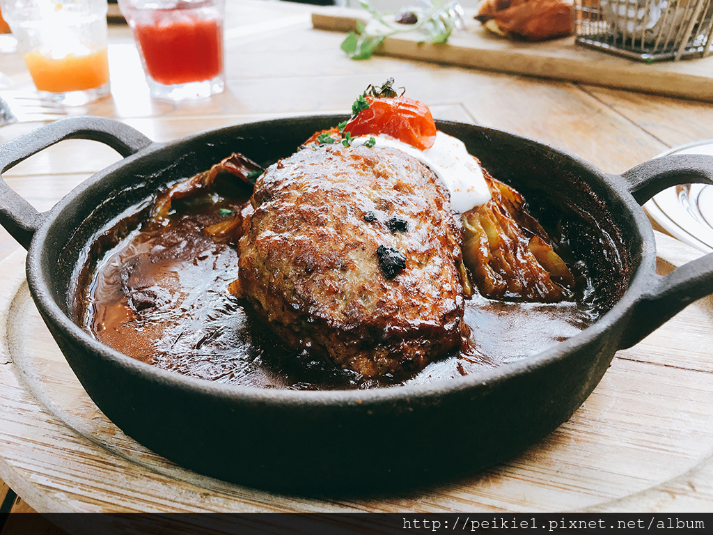 漢堡排上有優格奶油醬加上一顆番茄,