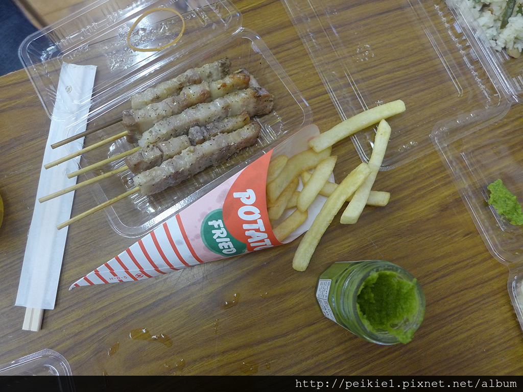日本朋友還去拿了山豬肉串燒跟炸薯條來給我們,