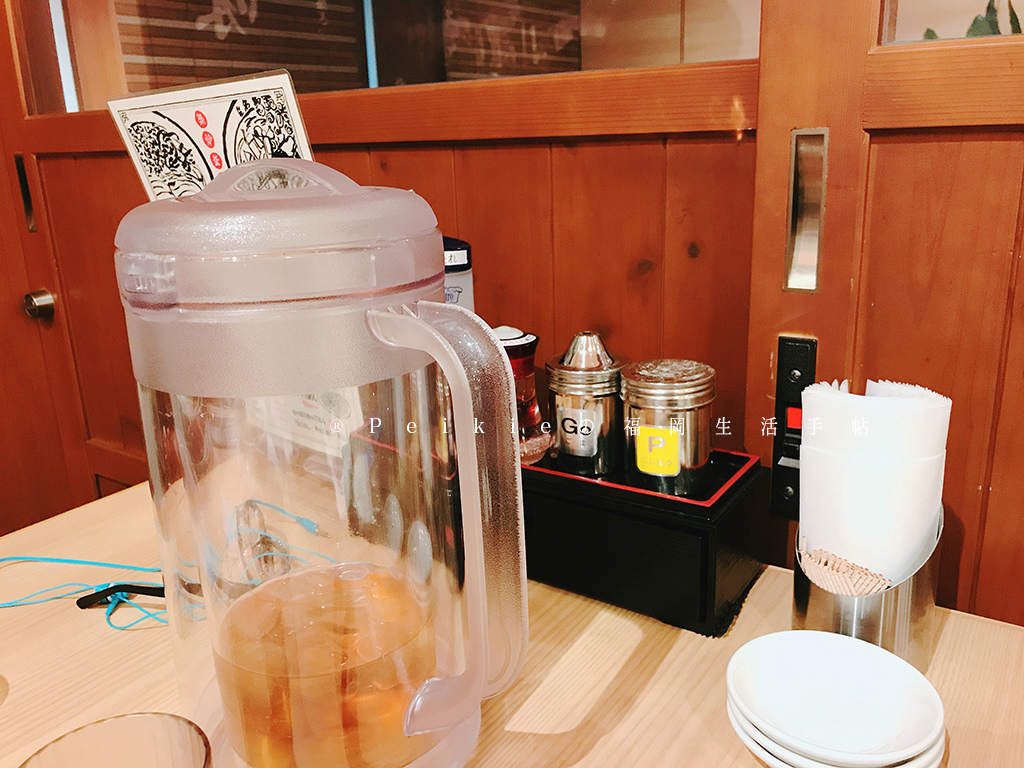 桌上也附上小碟子、冰茶、芝麻、胡椒粉、辣油、面紙…等。