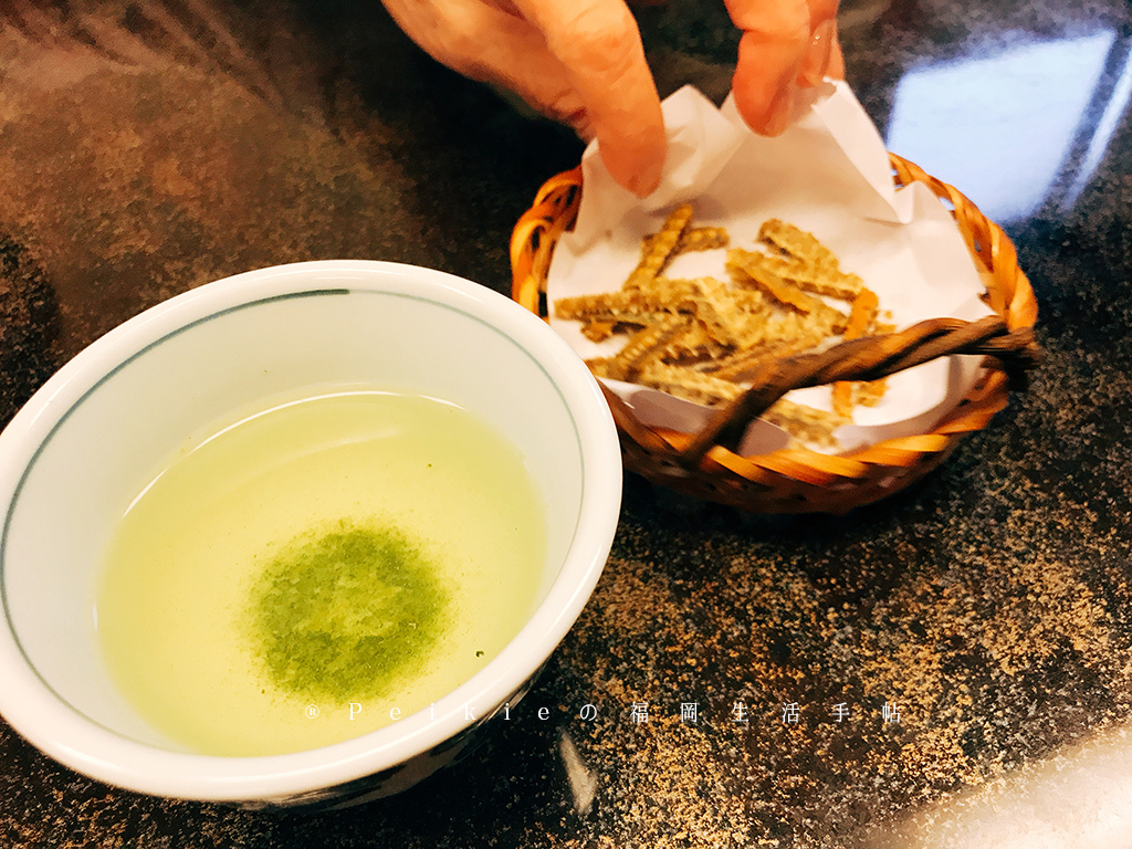 一坐定下來就送上煎茶與炸鰻魚骨,