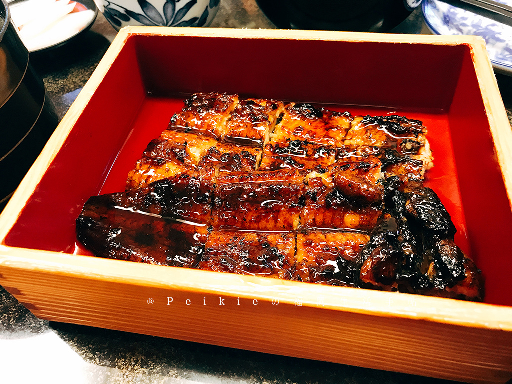 送上來的木盒鰻魚飯有兩大片鰻魚,