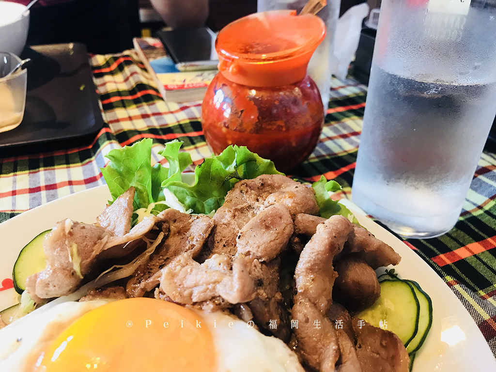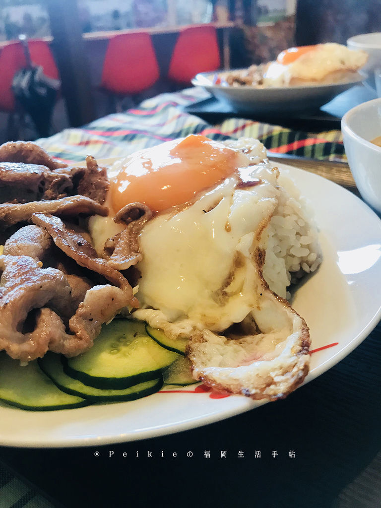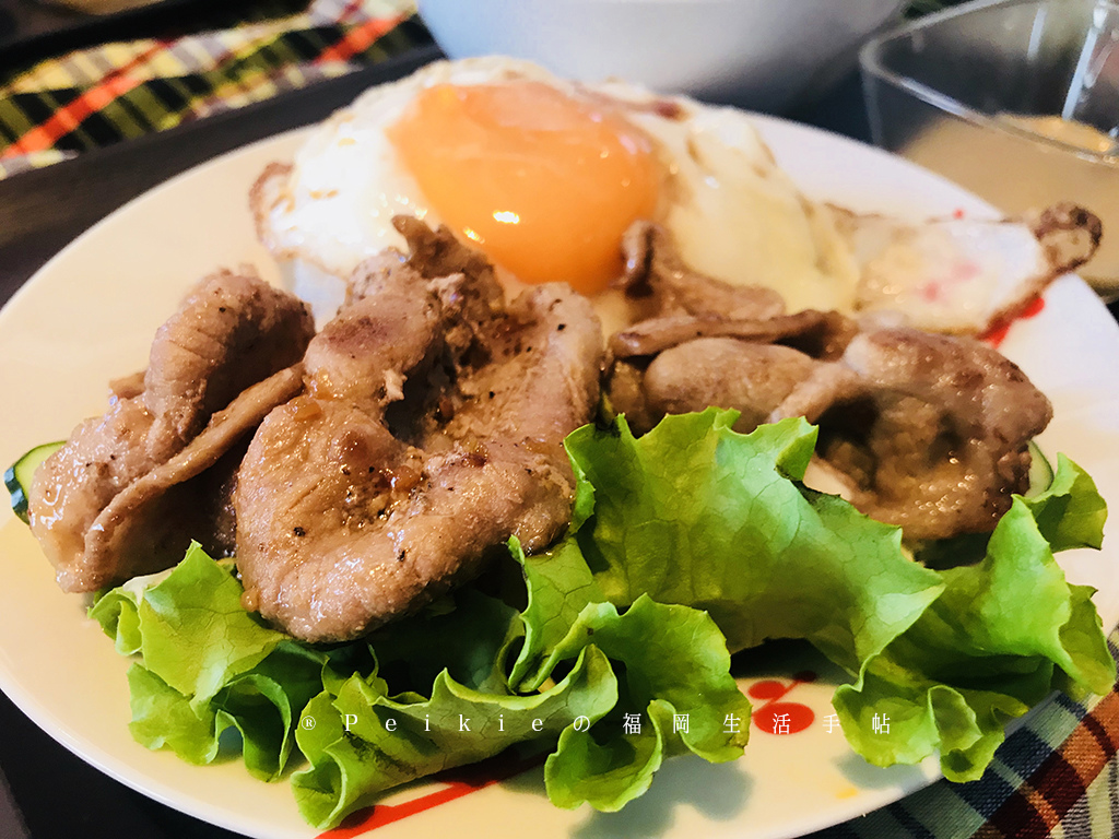 上面有很多片很大的炒豬肉與一顆荷包蛋和生菜沙拉。