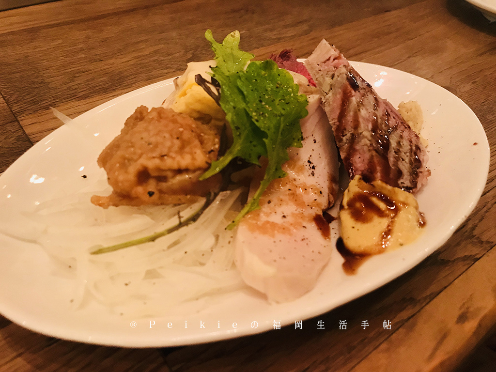 上面這道是「前菜5種類お盛り」,我跟白水小姐一起吃一盤,