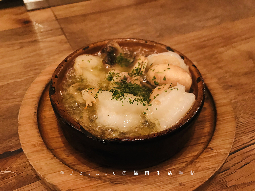 把蝦子跟蘑菇放到油裡面煮,許多日本的バル都有提供各式各樣的アヒージョ,