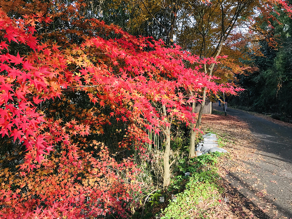 一進來秋月城跡之後,左邊有條小路都是紅葉,