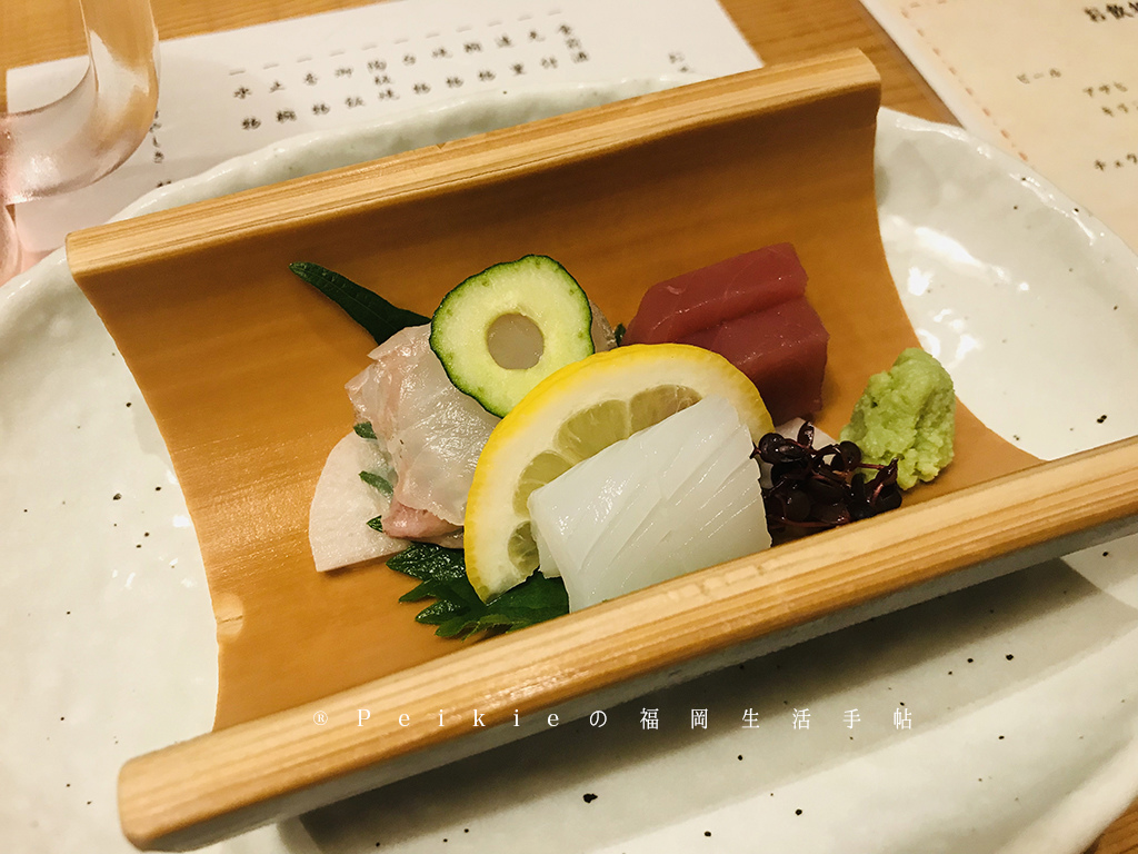 生魚片盤裡,有四片生魚片,還有一片花枝!