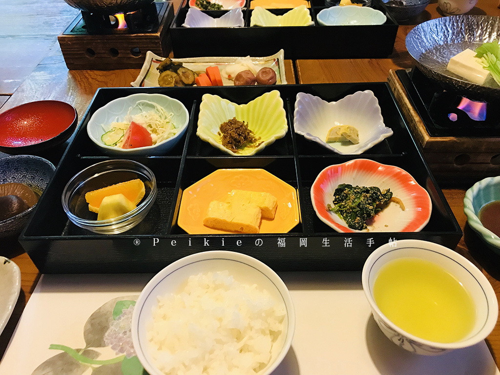 漬物、白飯、烤鮭魚、大根香菇煮、生菜沙拉、玉子燒、湯豆腐、辣蓮藕…等。