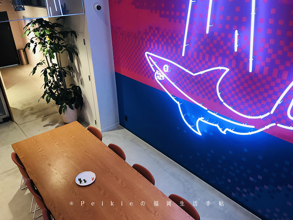 到處都是可拍照上傳到instagram的網美場景(日語:インスタ映),後面是海豚的霓虹燈,桌上的盤子居然有兩根小仙人掌。
