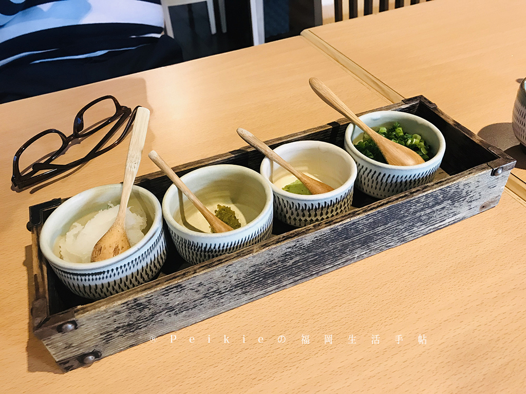 白蘿蔔泥(大根おろし)、柚子胡椒(ゆず胡椒)、芥末(わさび)、蔥(ネギ)