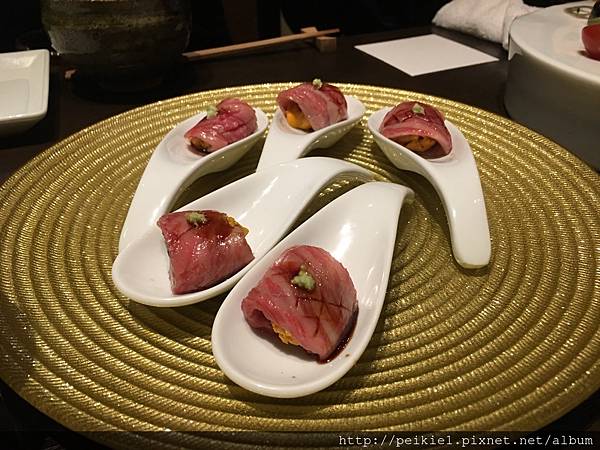 今天點的是「至福之時」套餐,總共有13道菜,而每個月都會因應季節更換菜單,使用當時的食材。第一道是餐前的美食醋,據說是草莓醋哦!喝起來甜甜酸酸很美味也很開胃。而第一道的三個小壽司真的超好吃,最右邊那是山藥的壽司卷,左邊其他2個是海鮮的小壽司。而下方的照片是八寸,總共五道開胃小菜,最注目的就是明太子了。